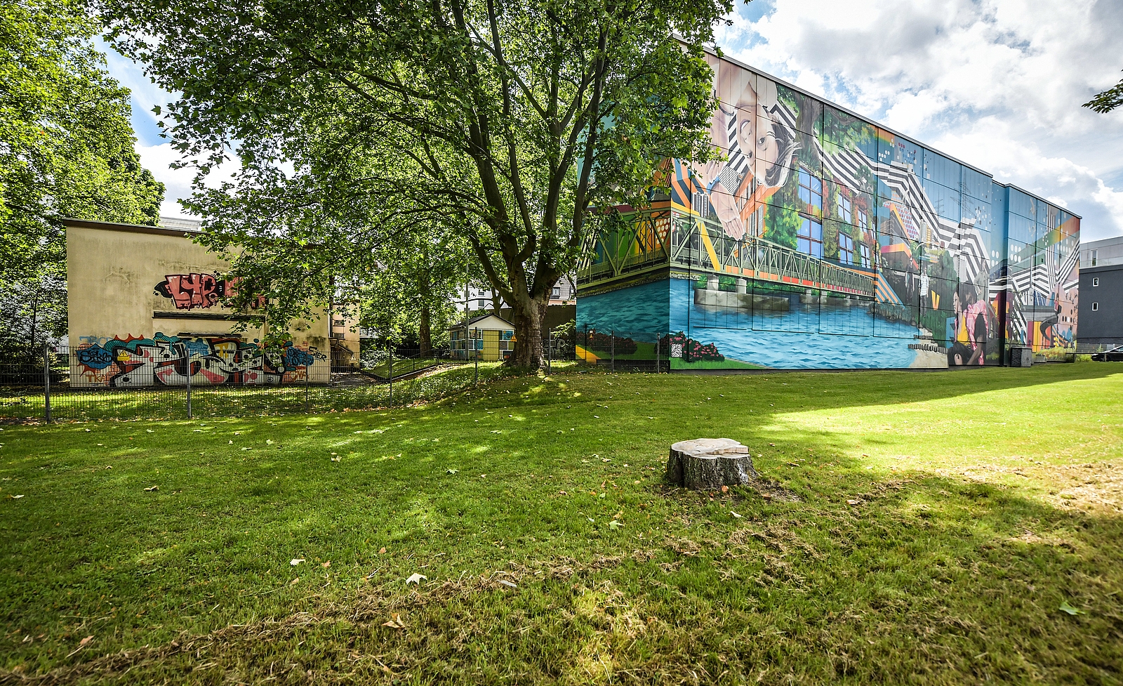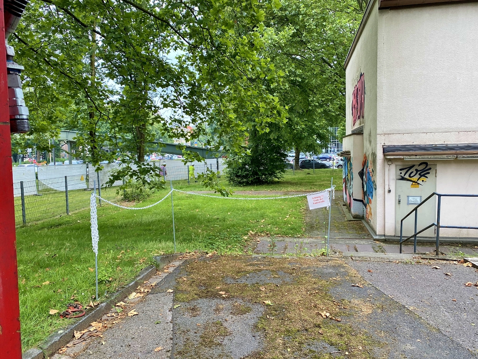 Neben dem Abriss der Gebäude, die wir zuletzt auch als Jugend- und Kulturzentrum retten wollten, ist eine Zufahrt zum Hauptgebäude geplant, die eine deutlich bessere Zugänglichkeit zu den dortigen Transformatoren ermöglichen wird. Dies ist wichtig, um im Falle eines Schadens schnell einen Austausch der 80t schweren 110kV-40MVA-Transformatoren vornehmen zu können. Zwei Bäume sind bereits gefällt und vier weitere werden folgen, dann wird von der Martinstraße aus ein Weg mit einer Rampe zur Überwindung der Höhenunterschiede hinter das bemalte, große Gebäude an der Alfredstraße führen, in dem sich die Transformatoren und darüber Schaltanlagen befinden, die ganze Stadtteile in der Umgebung versorgen.