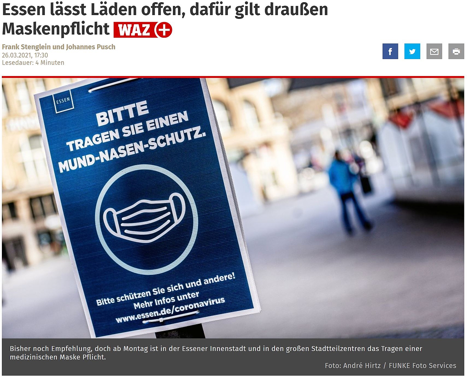 Obwohl Essen wegen der höheren Inzidenz eigentlich ein Kandidat für die „Notbremse“ ist, will Oberbürgermeister Thomas Kufen den Einzelhandel auch nach dem 29. März offenlassen und es bei der „Click and Meet“-Regel belassen wonach man nach Terminbuchung und Registrierung bei vorgegebener Personendichte in die Geschäfte darf. Hiermit wurden bisher sehr gute Erfahrungen gemacht.