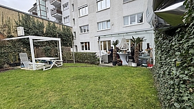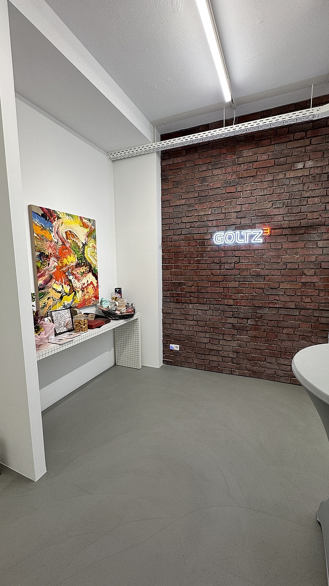 Es wurde nicht etwa durch einen großen Wanddurchbruch ein großer Raum geschaffen, sondern kunst-raum und goltz³ sind durch einen kleinen Durchgang verbunden, denn sie haben einen unterschiedlichen Charakter. Im Kunstraum werden eher figurative Werke gezeigt, und durch das unverbaute Schaufenster fühlt man sich wie mitten auf der belebten Rü. Die große Offenheit lässt alle Werke von außen sehen und lädt zum Eintritt ein. goltz³ dagegen ist durch Querwände nicht einsehbar und ist sowohl im Erdgeschoss als auch im Obergeschoss so abgeschlossen und ruhig, so dass man nicht merkt mitten auf der Rü zu sein. Ein kleiner Vorraum soll demnächst wie ein Mini-Studio direkt im Schaufenster für Filme, Reels oder Podcasts genutzt werden. Beide Galerien haben drei Etagen mit Ober- und Untergeschoss. Gemeinsam ist ihnen ein idyllischer Garten, der traditioneller Treffpunkt der Fan-Gemeinde ist und mit seinen Skulpturen in ruhiger Atmosphäre ebenfalls Anregungen bietet.