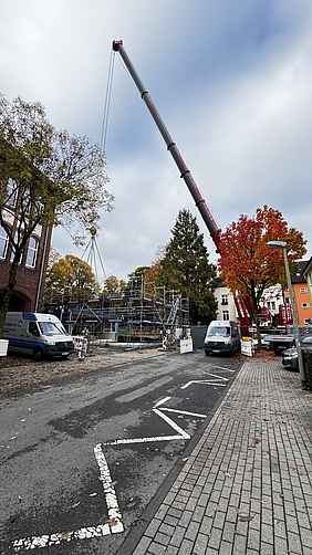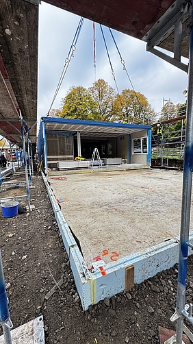 Der Bau des neuen Gebäudes der Käthe Kollwitz Schule schreitet voran. Damit eine lange Baustelle und Einschränkungen des Schulbetriebs vermieden werden, hat man vor einem Jahr die Planung auf Fertigbauelemente umgestellt, für deren Aufstellung die Ferienzeit reicht. Zuvor wurde das Fundament erstellt.