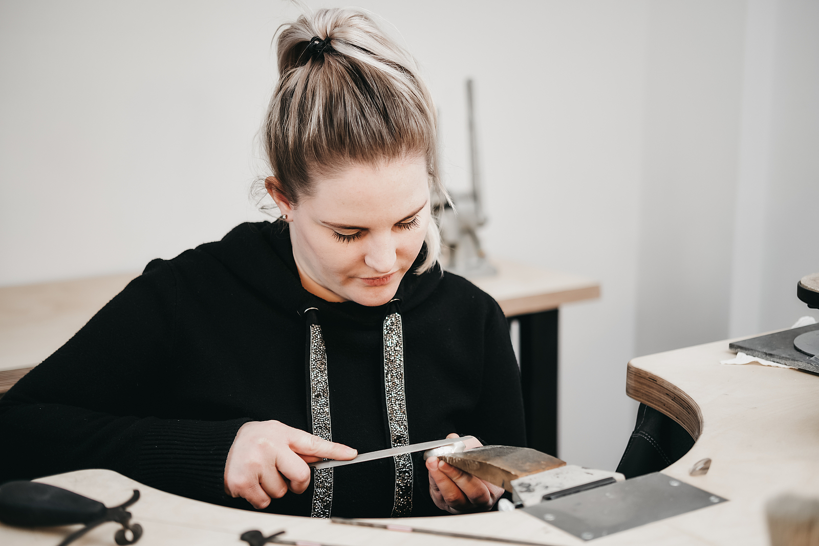 Die gelernte CADesignerin kombiniert die Möglichkeiten freien Gestaltens am Rechner mit ihrer traditionellen Handwerksausbildung und speziellen Kenntnisse im Bereich des Schmiedens. Das ermöglicht sehr freies Gestalten von gradlinig und geometrisch bis hin zu völlig freien figürlichen oder organischen Formen. Zudem bietet sie ihren Kunden einen sehr transparenten Produktionsweg. So kann sie mit Bildern der 3D Objekte oder sogar in Kunststoff gedruckten Modellen jeden Schritt mit dem Kunden teilen und besprechen.