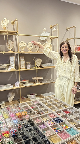 Seit 2009 präsentiert sie eine Riesenauswahl an verschiedenen Perlen und Schmuckzubehör in schöner Atmosphäre. Man kann stöbern oder wird von ihr zielsicher durch die glitzernde Vielfalt geführt.