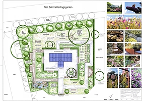 Im Mittelpunkt steht ein Schmetterlingshaus, das wegen der heute üblichen Lieferzeiten zunächst klein und im nächsten Jahr dann so groß, wie auf der Zeichnung, bestimmten Arten als Schutz dienen soll. Hier können sie auch überwintern.