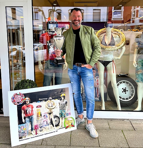 Wir gratulieren dem Modehaus Pfeffers in der Rüttenscheider Str. 261, das mit seiner Installation „Grand Prix und Motorracing" den 1 . Preis gewonnen hat.