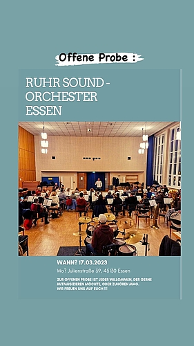 Am Fr. 17.3.23 veranstalten das Ruhr Sound-Orchester Essen wieder eine Offene Probe. Jeder Musikinteressierte ist herzlich eingeladen mitzuspielen oder zuzuhören.