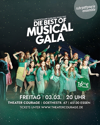 Das Rüttenscheider Ruhrpottpourie Ensemble präsentiert am 03.03. zum ersten Mal die #BestOfMusicalGala im Theater Courage ! Das Publikum erwartet die bekanntesten Ohrwürmer und schönsten Duette, die die Musicalwelt zu bieten hat.
