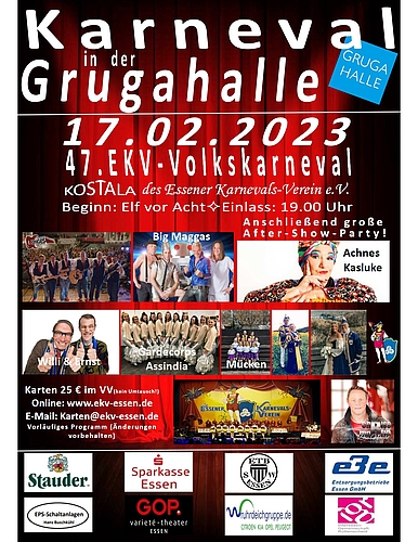 Der Essener Karnevals-Verein e.V. EKV veranstaltet auch in diesem Jahr die größte Galasitzung in Essen. Der 47. EKV-Volkskarneval in der Grugahalle Essen bietet ein buntes und kurzweiliges Programm.