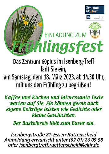 Zum Frühlingsfest lädt das Zentrum 60+ im Isenberg-Treff am Sa. 18.3.23 ab 14:30 Uhr in den Hof an der Isenbergstraße 81.