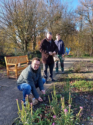 Wer etwas für Insekten tun will, pflanzt jetzt Blumen für das nächste Frühjahr. So geschieht es gerade auch im Schmetterlingsgarten des Stiftungsverein Grugapark Essen e. V., der kürzlich in den Mustergartenanlagen des Grugaparks eingeweiht wurde. Prof. Spie (Bild), der Vorsitzende des Vereins, beteiligte sich an den Pflanzungen und dankte dem Grugapark Essen für die Unterstützung.Im Frühling 2022 soll es dann im gesamten Schmetterlingsgarten blühen und sprießen. Die Besucher und die Insekten, allen voran natürlich Schmetterlinge, sollen sich an der Blütenvielfalt im neuen Jahr erfreuen können. Zu diesem Zweck wurden, finanziert durch den Verein, qualitativ besonders hochwertige Blumenzwiebeln besorgt, wie generell hier vor allem Schmetterlingsfreundliche Pflanzen installiert wurden (s.u.).
