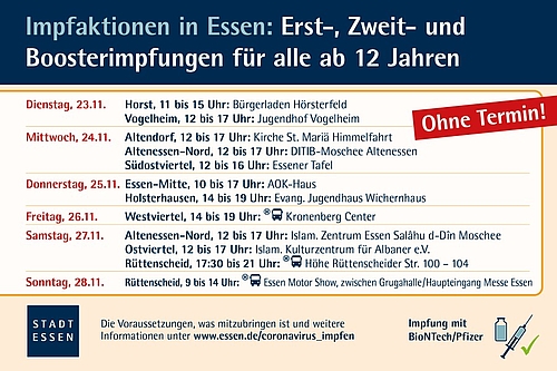 Am Sa. 27.11.21 und 18.12. von 17:30-21 Uhr ist der Impf-Bus der Stadt Essen auf der Rü 104, gegenüber der Siechenhauskapelle und am So. 28.11. von 9-14 Uhr an der Grugahalle.