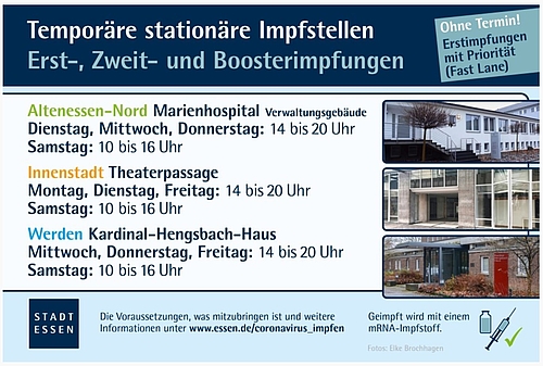 Weil es naheliegt mehr Angebote zu schaffen, sind neben der Aktivierung möglichst vieler Ärzte, drei feste Impfstationen in Essen Impf-Angebote