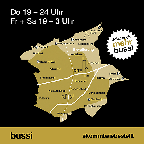 Seit Anfang März ist Bussi, der On-Demand-Shuttle der Ruhrbahn GmbH, in Essen unterwegs. Jetzt wird das Angebot, das trotz der Corona-Krise sehr gut angenommen wurde, erweitert: Ab sofort können Kund*innen Bussi auch donnerstags buchen – und zwar in der Zeit von 19 bis 24 Uhr. Freitags und samstags wird die Zeit, in der man mit Bussi fahren kann, um eine Stunde, also bis 3 Uhr, verlängert. Das Gebiet, in dem Bussi gebucht werden kann, wird zudem um einige Essener Stadtteile in Richtung Borbeck, Bergeborbeck, Altenessen, Stoppenberg (Zeche Zollverein) und Steele erweitert. Das genaue Bussi-Bedienungsgebiet ist auf der Website bussi.ruhrbahn.de auf einer digitalen Karte sowie in der Bussi-App zu sehen.