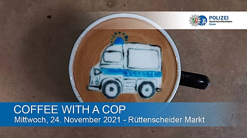 Bürgernähe und Interesse an der Situation vor Ort wird bei unserer Polizei und vor allem bei den allseits bekannten Bezirksbeamten schon immer groß geschrieben. Jetzt bietet die Aktion „ Coffee with a cop“ am Mi. 24.11.2021 von 8-13 Uhr auf dem Rüttenscheider Markt Gelegenheit zu lockeren Gespräche mit den Orts-Polizisten bei einem Kaffee am Stehtisch. Neben den Bezirksbeamten sind auch Vertreter zum Thema Prävention dabei.