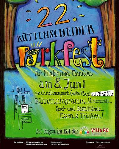 Die Villa Rü veranstaltet mit Partnern am 8.6.24 von 14-18 Uhr wieder das vor allem bei Kindern und Eltern beliebte Parkfest mit Kinderaktionen, Bühnenprogramm und Speis und Trank.
