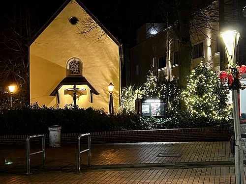 Auch an der Siechenhauskapelle leuchtet es zum Advent jetzt wieder. Der Weihnachtsbaum der wieder von der Rüttenscheider CDU aufgestellt wurde, wurde wie jedes Jahr, zusammen mit den umliegenden Büschen von der IGR beleuchtet. (Im Bild Rolf Krane, Hans-Peter Huch)