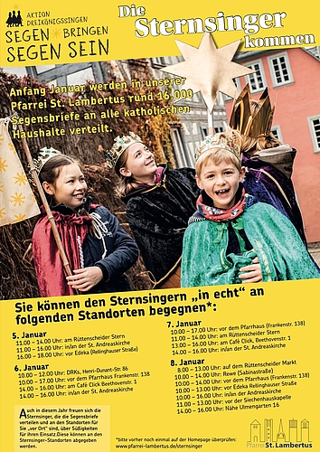 Auch am Anfang dieses Jahres findet wieder die Sternsinger Aktion der Gemeinde St. Ludgerus und Martin und St. Andreas mit der Pfarrjugend St. Andreas statt. Leider können die jungen Leute, diesmal nicht von Tür zu Tür gehen, den Segen bringen und für einen guten Zweck sammeln. Dafür werden verschiedene Standorte als Begegnungsmöglichkeit mit den Sternsingern vorbereitet. Siehe Plakat.