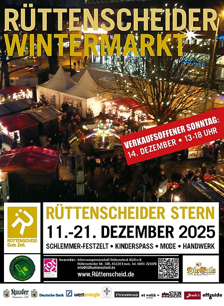 Der 22. Rüttenscheider Wintermarkt findet vom Do. 11. - So. 21.12.25 statt, verbunden mit einem Verkaufsoffenen Sonntag und Kunstmarkt in der Villa Rü am 14.12.25.