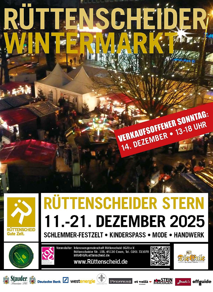 So spiegelt der Wintermarkt die Vielfalt und Atmosphäre Rüttenscheids wider und stellt ein stimmungsvolles Stadtteilfest mit Wir-Gefühl dar, das die Menschen im Stadtteil zusammenführt. Er wird auch wieder viele Freunde Rüttenscheids zu geselligem Beisammensein anziehen.