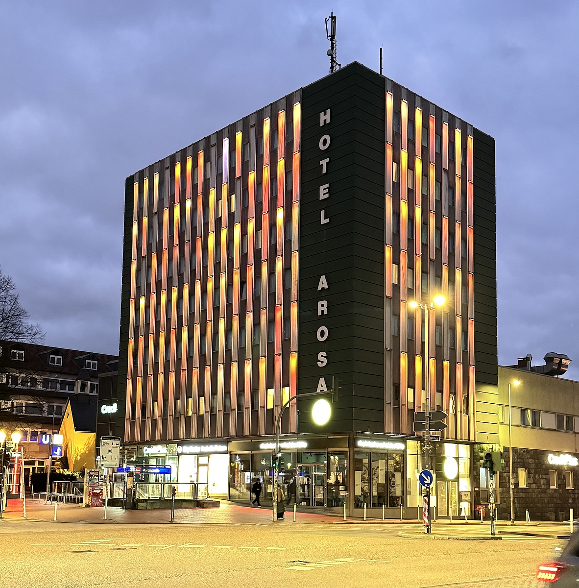 Mit allgemeiner Freude wurde aufgenommen, dass das Hotel Arosa Gebäude seine Fassadenbeleuchtung wiederhat.